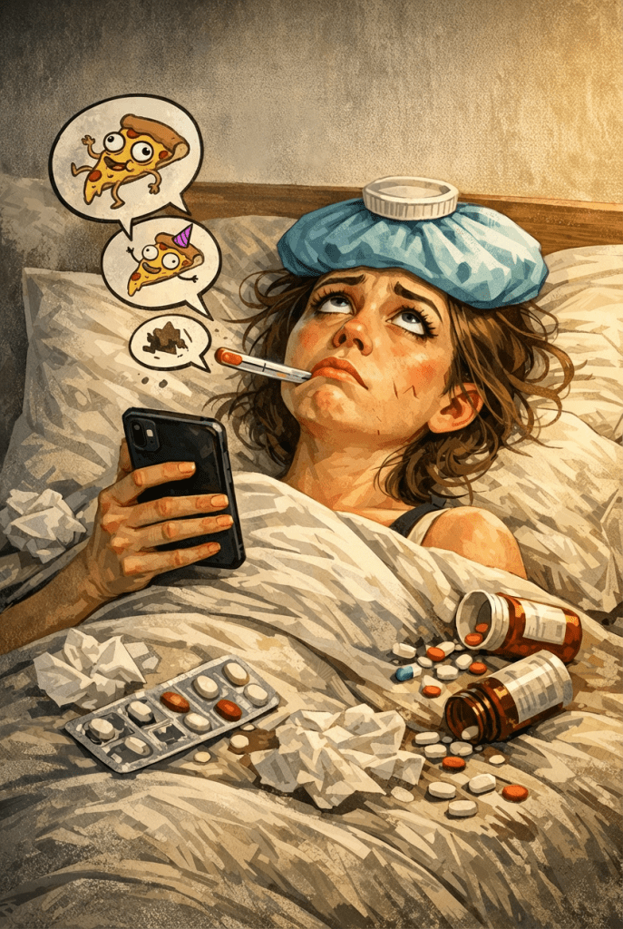 Ze belde me op met de energie van iemand die net de loterij had gewonnen: “O mijn GOD, je gelooft nooit wat er is gebeurd!” En ja.. achteraf ik geloofde het inderdaad ook niet…Ze ging los over: hoe die collega de magnetron opende, hoe hij zei: “Hij doet een beetje raar.”, hoe zij meteen voelde dat “dit fout ging”, hoe de pizza erin en eruit ging, hoe het apparaat begon te brommen alsof het wilde opstijgen, hoe de rookmelder bijna een existentiële crisis kreeg, hoe de hele afdeling in paniek raakte, hoe de pizza eruitzag, hoe de pizza rook. En ik zat daar… met de telefoon aan mijn oor en ik vroeg me emotioneel af: HOE?! HOE kan iemand 40 minuten praten over een verbrande pizza? Is dit een superkracht? Een ziekte? Een performance art?” Na twintig minuten voelde ik dat mijn brein langzaam begon los te koppelen. Na dertig minuten zag ik mijn leven aan me voorbij trekken. Na veertig minuten lag ik al op de bank als het slachtoffer van een culinair drama, telefoon op de luidspreker, ogen naar het plafond, ziel buiten het lichaam. De rest van de dag lag ik in bed, met een blik alsof ik net een ramp had overleefd.